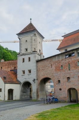 The structure combines both square and octagonal architectural elements within its five stories, making it distinct among Bavarian city gates.