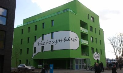 The Algenhaus is a residential building in Wilhelmsburg with special glass panels on its facades where microalgae grow. These panels on the southwestern and southeastern sides create a green surface that changes constantly throughout the day.