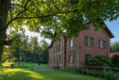 The Baden family coat of arms is displayed above the windows and shows the architectural tastes of German nobility from the 19th century. These decorative details were typical of private country estates that expressed the status and refinement of their owners.