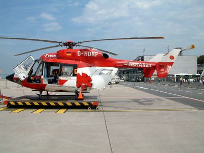 The red and white helicopter represents a vital component of German emergency medical infrastructure, working alongside ground ambulances and hospitals.