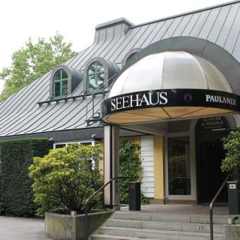 The Seehaus establishment features both indoor dining spaces and outdoor terraces overlooking Kleinhesseloher Lake within Munich's English Garden.