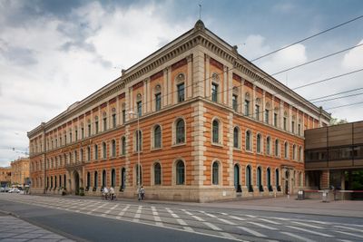 The building incorporates classical architectural elements, including pilasters, sandstone acroteria, and a distinctive yellow brick facade with red decorative bands.