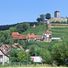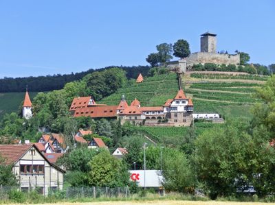The Unteres Schloss sits between the town center and Hohenbeilstein Castle, featuring arcade walkways, a columned knights' hall, and half-timbered corner turrets.