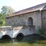 A substantial three-story tower stands at the southeastern corner of the manor house, with its arch spanning across the moat.