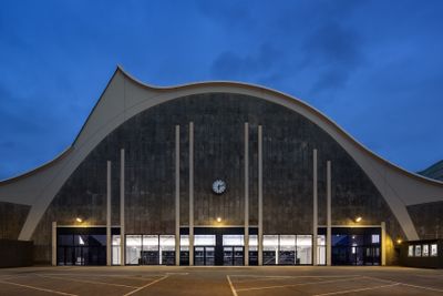 The theater opened in 2015 inside the Großmarkthalle, a protected structure designed by architect Bernhard Hermkes in 1962 for commercial purposes.