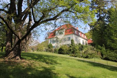 The Haus HohenEichen building stands on a hillside overlooking the Elbe River, surrounded by oak trees at the southeastern edge of Dresden.