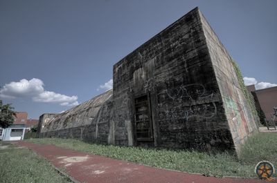 Bunker Luckenwalde Salzgitter is an air-raid shelter made of reinforced concrete located near a school in the town. The structure features thick walls and a curved roof built to withstand aerial attacks.