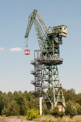 This facility was built in 1954 as the first model of a crane series used for assembling and disassembling port cranes. It operated at Kranbau Eberswalde until 1990, when it became preserved as an industrial monument.