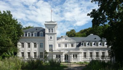 Villa Carlshagen is a residential building on the shores of Templiner See in Potsdam, featuring classical architecture from the early 20th century. The structure displays a mansard hipped roof with dormers, ornamental columns, and relief decorations across its roughly 1,900 square meter space.