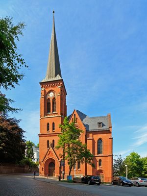 The Schmerzhafte Mutter St. Maria-Kirche is a red brick neo-Gothic church in central Flensburg with a distinctive polygonal choir oriented to the north. The building features a bell tower positioned at its southwestern corner, creating its characteristic silhouette above the city center.
