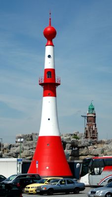 The red and white striped cast iron tower stands 26 meters tall next to the Zoo am Meer on the Seebäderkaje promenade.