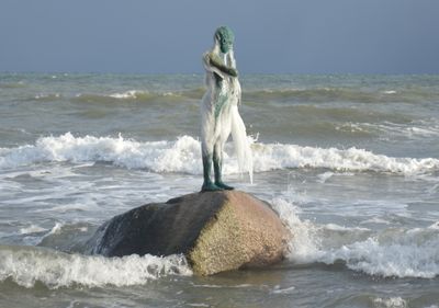 The bronze figure Kaysa stands 168 centimeters tall on a boulder in the Baltic Sea near the southern beach of Sellin.