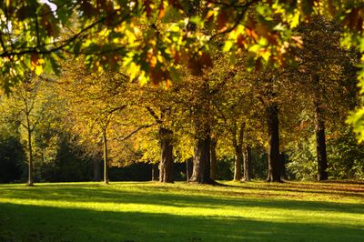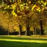 The white oak trees in the park display irregularly lobed leaves that turn wine-red during autumn months.