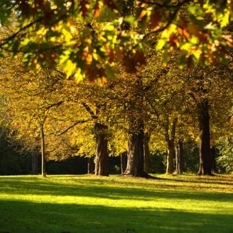 The eleven-hectare park features wide meadows, winding paths, a 9500-square-meter pond, and numerous tree species including red beech and maple trees.