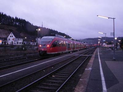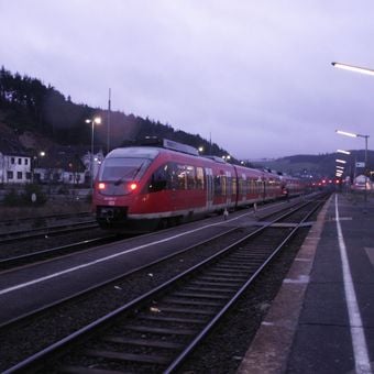 The railway station features three platform tracks and operates as a transit station at an elevation of 379 meters in North Rhine-Westphalia.