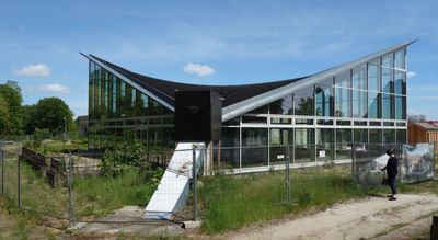 The building represents one of architect Ulrich Müther's concrete shell structures, demonstrating innovative engineering techniques from the 1970s.