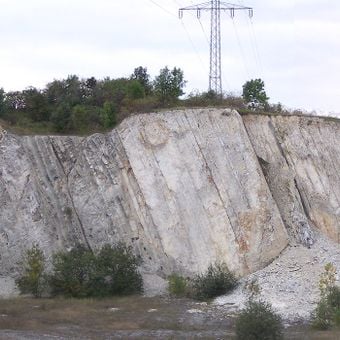 The quarry stretches across 12 hectares, reaching 750 meters in length and 320 meters in width, with steep limestone layers and marl formations.