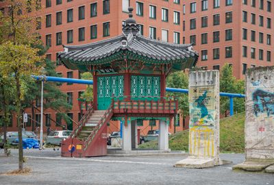 The pavilion incorporates sections of the Berlin Wall in its surroundings while replicating the Sangnyangjeong pavilion from Seoul's Changdeokgung Palace.