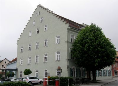 Gasthof Angerbräu, dreigeschossiger freistehender Satteldachbau mit Treppengiebeln, Putzgliederung und Rundbogenfenstern, nach 1851, Haustür Mitte 19. Jahrhundert