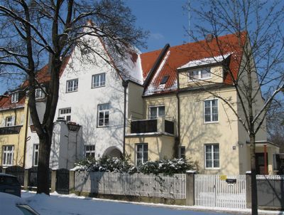 Block aus drei Villen, guppenbau aus drei Villen, zweigeschossiger historisierender Satteldachbau mit Altanen und mittlerem Giebelbau, westlich mit Schopfwalmdach abschließend, von Franz Rank, 1902–03