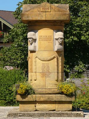 Kriegerdenkmal, sandsteinsäule auf Sockel mit Deckplatte und Giebelchen, vier eingesetzte Granitblöcke mit Soldatenköpfen, Inschriften, um 1925