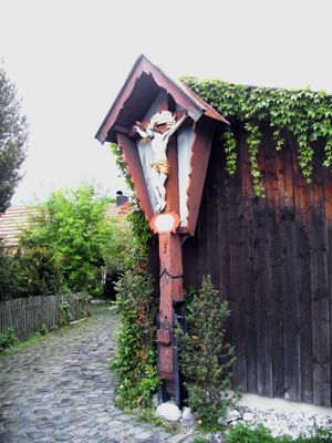 Wegkreuz, gefasster barocker Holzcorpus unter Wettermantel, wohl 18. Jahrhundert, Kreuz bezeichnet 1854