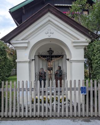 Figurengruppe, offene Ädikula mit barocker Stuckgliederung, angeblich 1843, mit großer Figurengruppe (Kreuzigung)