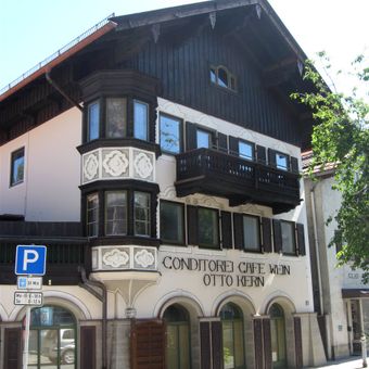 Saalbau der Konditorei Kern, putzbau mit Flachsatteldach über Blockbau-Kniestock, Details im Stil der 20er-Jahre, großes Giebel-Wandgemälde von Heinrich Bickel, 1936