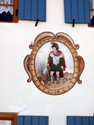 Mühle, zweigeschossiger Halbwalmdachbau mit Fresko auf der Nordseite, im Kern 1734, 1. Hälfte 19. Jahrhundert