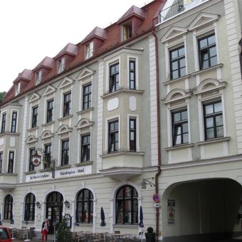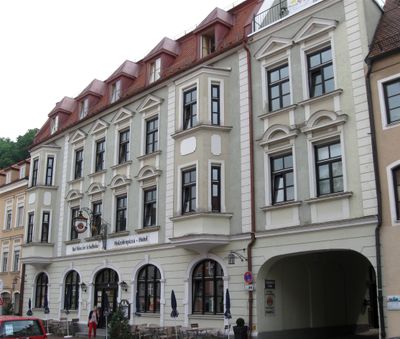 Gasthof Schafbräu, stattlicher dreigeschossiger Traufseitbau mit neubarocker Putzgliederung, Erkern und Mansarddach, im Kern 16./17. Jahrhundert, weitgehend neu errichtet von Carl Maurer, 1902