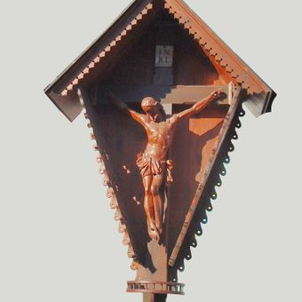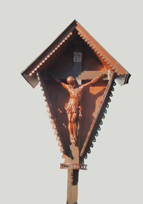 Kruzifix, gehäuse mit reichen Laubsägeornamenten, 19. Jahrhundert