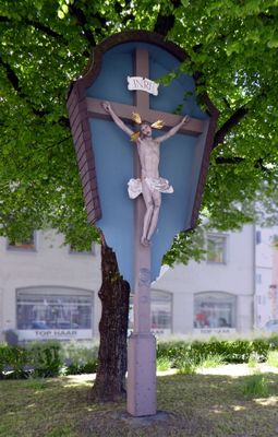 Kreuz am Rathausplatz, barocker Korpus am Kreuz mit Einhausung, Holz, 2. Hälfte 17. Jahrhundert