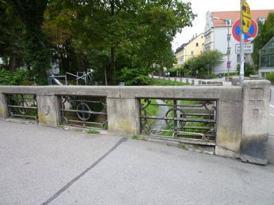 Bach-Brücke in Straubing, tragewerk aus kassettierter Betonplatte, mit Formbeton-Brüstungen und schmiedeeisernen Gittereinlagen, bezeichnet mit „1907“