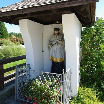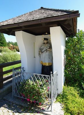 Nepomuk-Kapelle, holzfigur hl. Johann von Nepomuk, zweite Hälfte 18. Jahrhundert; aufgestellt in der im Zuge des Brückenneubaus 2007 neu erbauten Kapelle