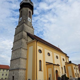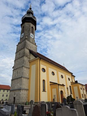 Mariä Himmelfahrt, katholische Pfarrkirche, Chor und Langhaus, von Lorenzo Sciasca, 1680-82, Turm spätgotisch, 15. Jahrhundert, Langhausgewölbe und Turmhaube 1891 wiedererrichtet; mit Ausstattung