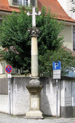 Wegkreuz, korinthische Säule mit Kreuzaufsatz, auf profiliertem Inschriftsockel, barock, 1765, renoviert 1865, 1922 versetzt, Steinkreuz 1978 erneuert