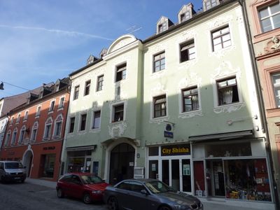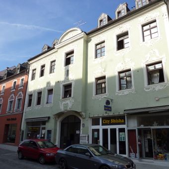 Fraunhoferstraße 21, dreigeschossiger traufständiger Steildachbau mit Flacherker, im Kern 15./16. Jahrhundert, Rokokofassade, letztes Viertel 18. Jahrhundert