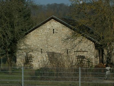Scheune, zugehörige Scheune in Jurabauweise, Kalkbruchstein-Bau mit Kalkplattendach, erste Hälfte 19. Jahrhundert