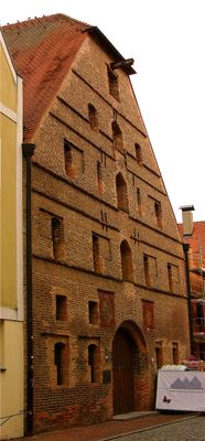 Steckengasse 308, dreigeschossiger Ziegelbau mit Schopfwalm, zu beiden Seiten des Torbogens aufgemalte Wappenschilder, 15. Jahrhundert