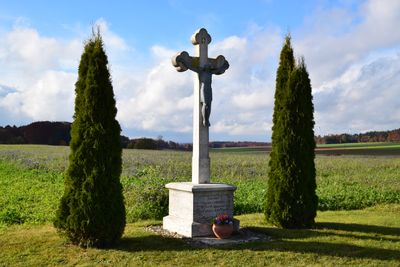 Wayside cross, pfeilerartiges Steinkreuz auf quadratischem Sockel, mit eisernem Corpus, bezeichnet mit dem Jahr 1940; am Westende des Ortes