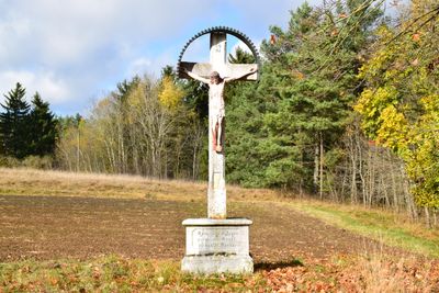 Wayside cross, pfeilerartiges Steinkreuz auf rechteckigem Sockel, mit eisernem Corpus, um 1922; am Westende des Ortes