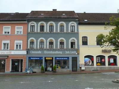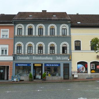 Eisenhandlung, dreigeschossiger Bau in Traufstellung, rundbogige Fenster mit genuteter Rahmung, drittes Viertel 19. Jahrhundert