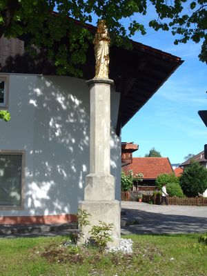 Steinsäule, mit Holzfigur, bezeichnet 1875