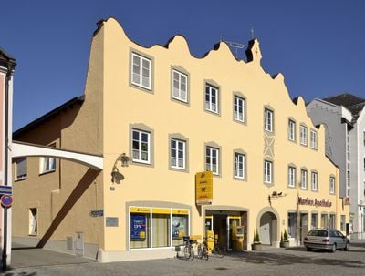 Gasthof, zweigeschossiger breitgelagerter Schweifgiebelbau mit flachem Satteldach, 18. Jahrhundert