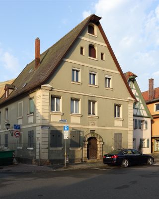 Friedrichstraße 1, zweigeschossiger, giebelständiger und verputzter Steilsatteldachbau mit Aufzugsdächlein und Putzgliederungen, bez. 1719, nach 1731