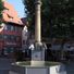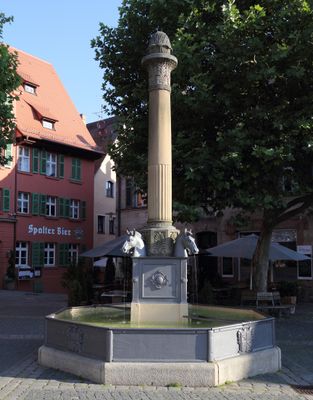Pferdebrunnen, oktogonales Becken, über eingestelltem Sockel mit Pferdeköpfen Sandsteinsäule mit Pinienzapfen, 1823 nach Entwurf von Carl Alexander von Heideloff