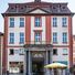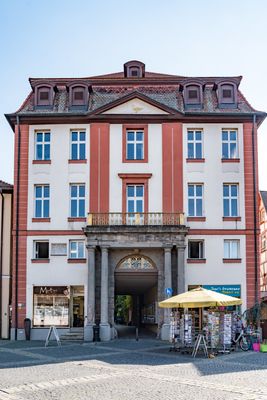 Königsplatz 29, viergeschossiger, verputzter Mansardwalmdachbau mit Zwerchgiebel, Lisenengliederung und Säulenportal, barock, von Carl Friedrich von Zocha, 1726-28