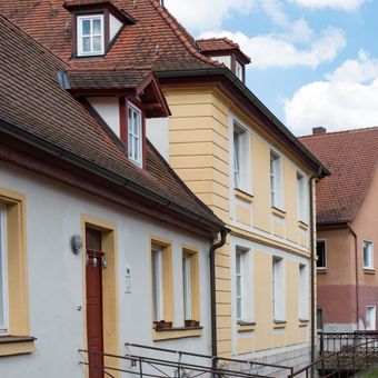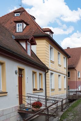 Münzgasse 5, zweigeschossiger, verputzter Walmdachbau mit Putzgliederung und erdgeschossigem Flügel am Mühlbach, barock, bez. 1734