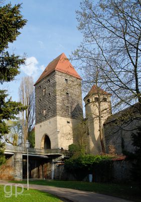 Ziegeltor, nordöstliches Stadttor, dreigeschossiger rustizierter Walmdachbau, um 1580, auf spitzbogigem gotischem Unterbau, flankiert von zwei Batterietürmen mit Walmdach und kurzen Mauerstücken mit Fußgängerpforten und Wehrgang