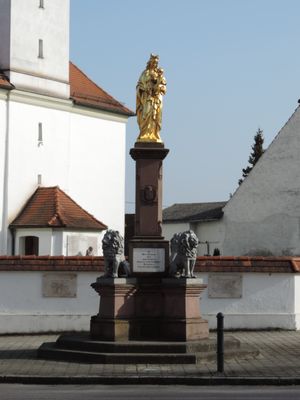 Kriegerdenkmal, auf kreuzförmigem Postament mit vier sitzenden Löwen ein Pfeiler mit der Figur der Patrona Bavariae, um 1875